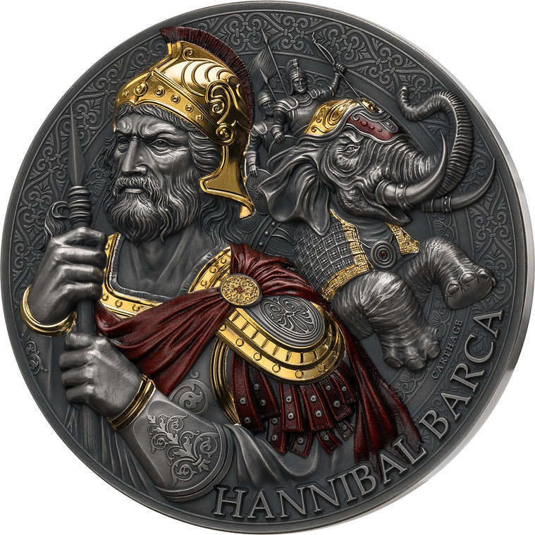 This impressive 5 oz silver collector coin is dedicated to the great military leader Hannibal Barca, whose legend comes to life in high relief detail. Dramatic antique finish, gold plating, and red accents emphasize the strength and determination of the hero who crossed the Alps with his war elephants. The reverse features Hannibal surrounded by symbols of ancient power and unyielding will. The coin comes in an elegant case with a certificate of authenticity. Limited edition of only 750 pieces worldwide.