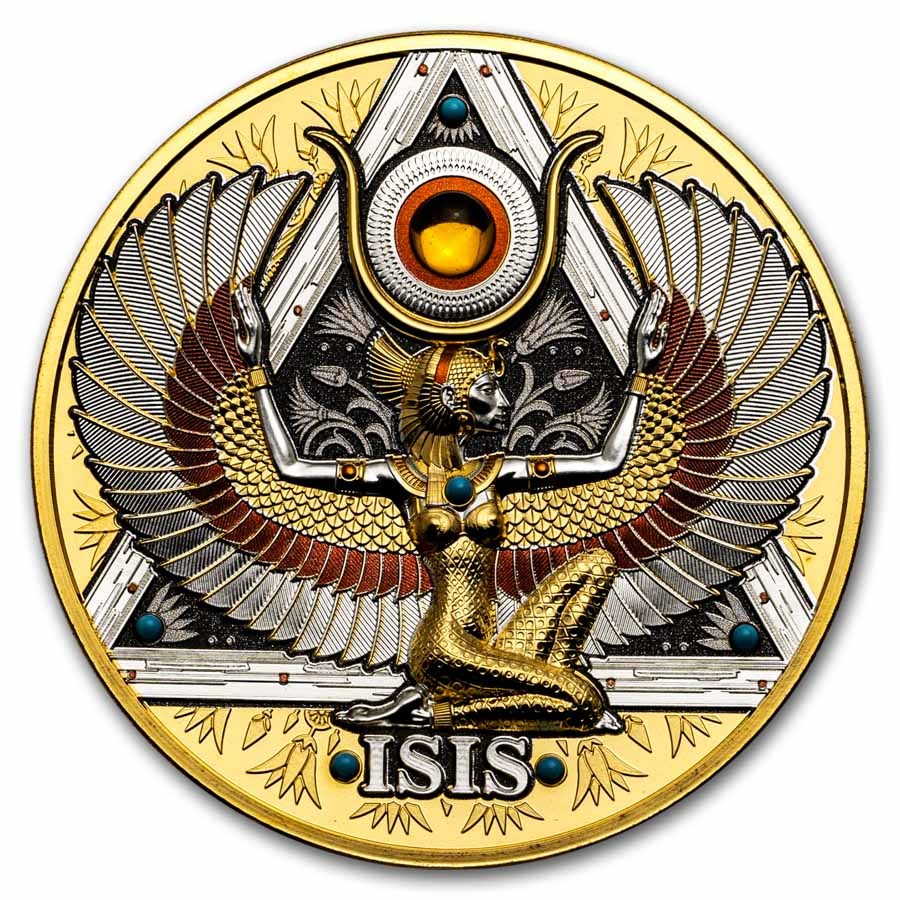 This impressive silver coin is part of the “Golden Greatness” series and is dedicated to the ancient Egyptian goddess Isis, the deity of motherhood, magic, and protection.
