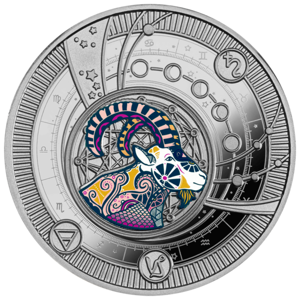 This exquisite silver coin from the “Zodiac Signs” series is dedicated to Capricorn, an earth sign symbolizing steadfastness, responsibility, and inner strength. The reverse features Capricorn decorated with delicate ornaments and patterns against a backdrop of the starry sky and zodiac symbols. The coin is minted in Proof quality with impressive detail and bright colour. An elegant pendant ring allows it to be worn as jewelry, emphasizing the individuality of the owner. The coin is issued in a case with a certificate of authenticity and is limited to only 599 pieces worldwide.