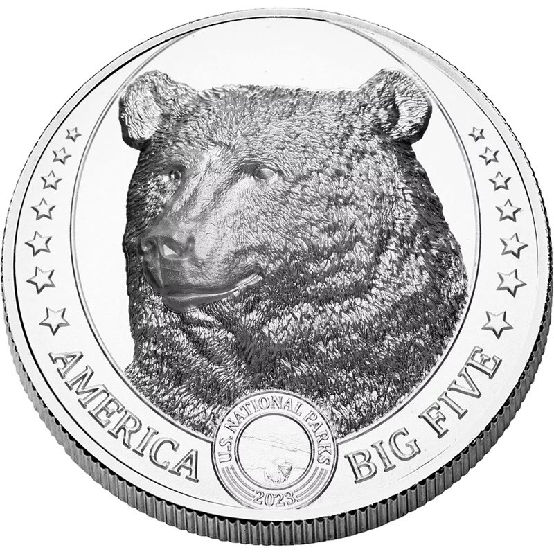 The 2023 Fiji America Big Five Brown Bear coin is struck from 0,999 pure silver with a weight of 1 oz and features an ultra-high relief design. This issue continues the America Big Five series dedicated to iconic North American wildlife. The obverse presents a powerful close-up portrait of a Brown Bear, with exceptional detail highlighting the texture of the fur and the strength of the animal. Surrounding inscriptions include AMERICA, BIG FIVE, the year 2023, and US National Parks. The ultra-high relief striking technique enhances depth and dimensionality, creating a striking visual effect. This release is highly sought after by collectors and enthusiasts of premium high-relief silver coins.