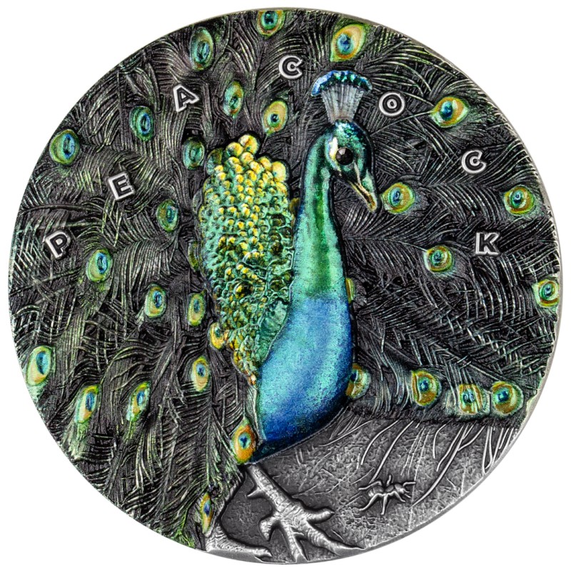 Niue: collectible silver coin Amazing Animals. Peacock 2022 (colored), 93.3 g pure silver (0.999)