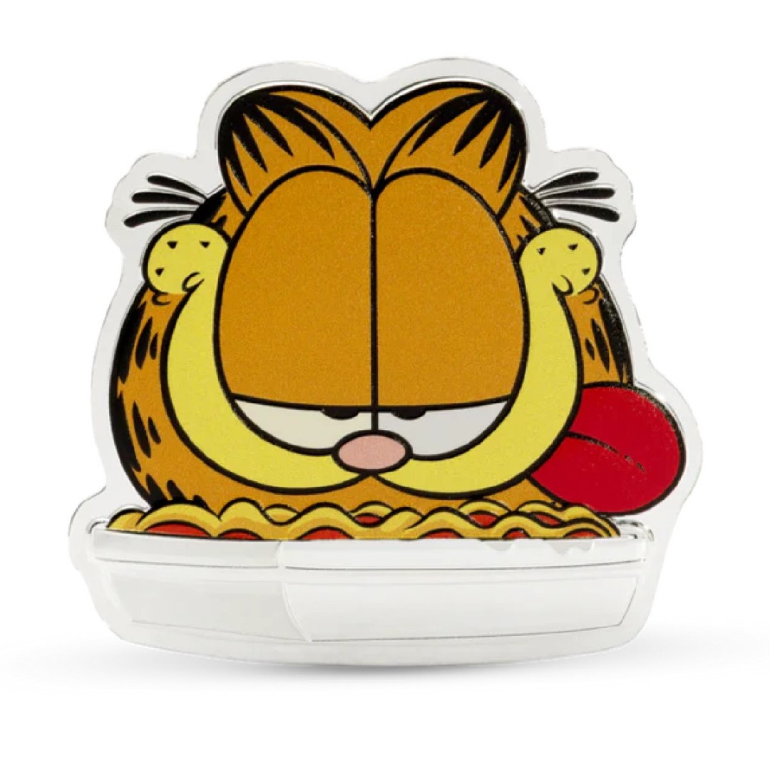 This vibrant collector coin is dedicated to the iconic cat Garfield - and, of course, his favorite dish. Issued for National Lasagna Day, it features Garfield in his characteristic manner - with eyes squinted and tongue out - enjoying a tray of lasagna. The coin is made of 1 ounce of pure 0.999 sterling silver, features a shaped shape and color finish, and is officially licensed by Nickelodeon. This is the second release in the Garfield silver coin series, with a limited edition of only 1,000 pieces worldwide. Comes in colorful themed packaging with a window display.